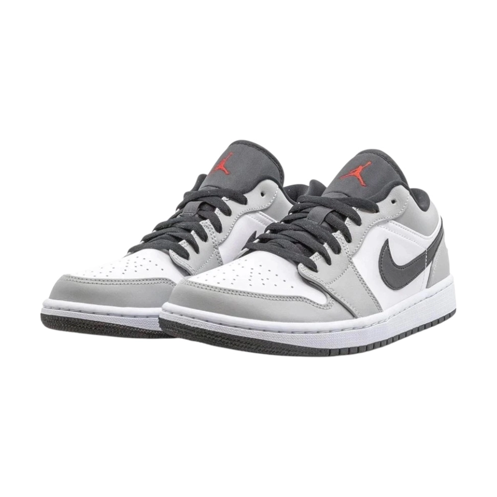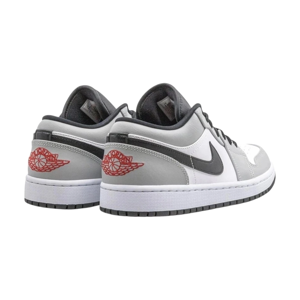 Jordan 1 Low „Light Smoke Grey“ – nadčasový model v elegantní kombinaci bílé, šedé a černé s ikonickým červeným Jumpmanem pro čistý a stylový look.
