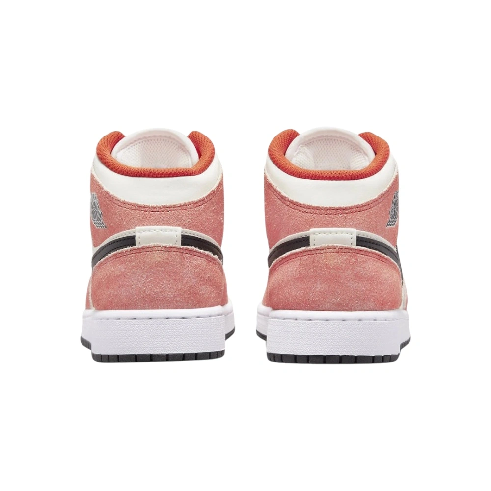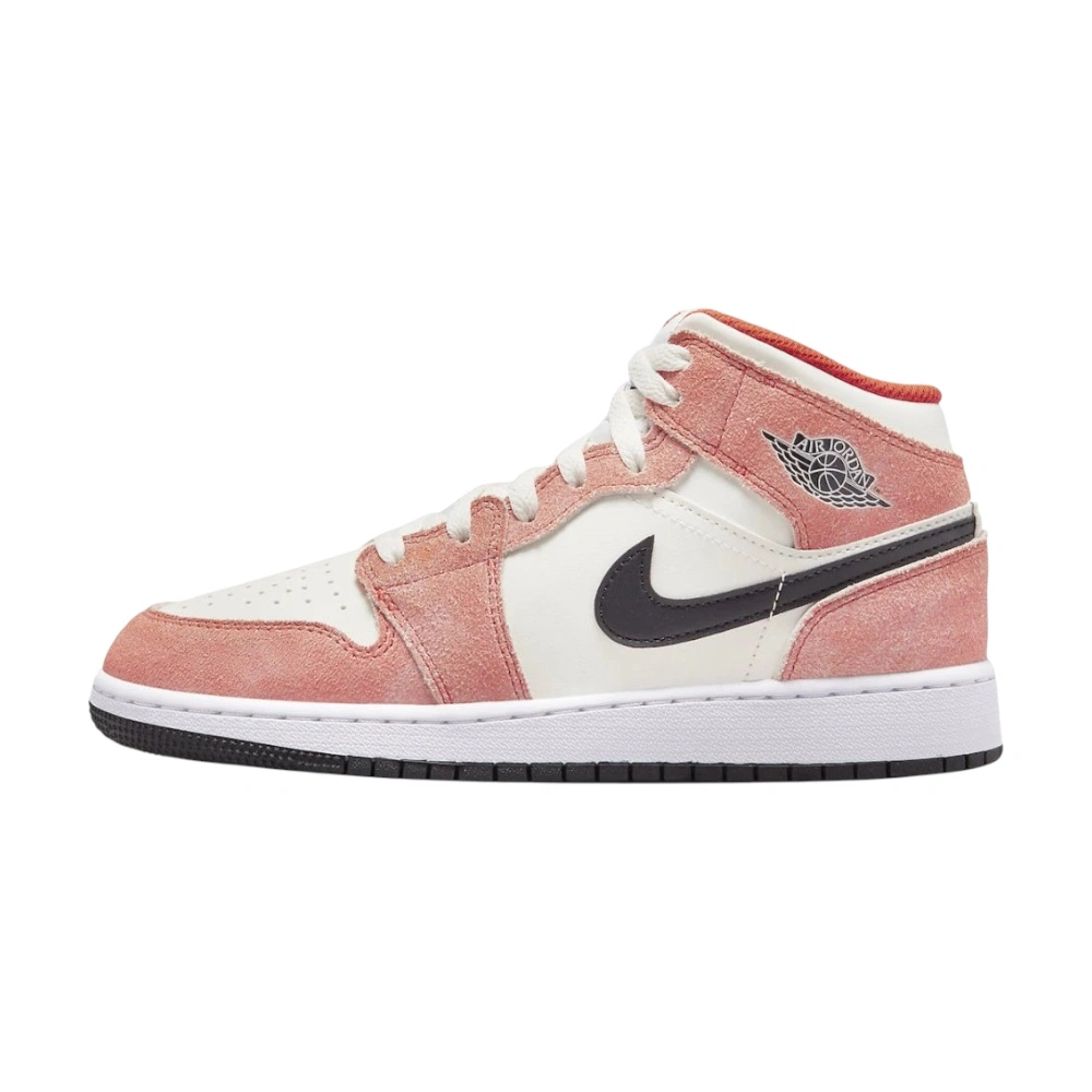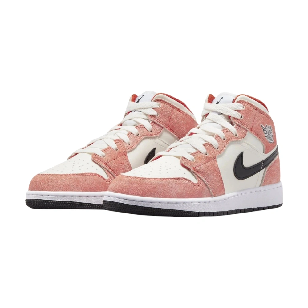ordan 1 Mid SE “Orange Suede” (GS) v kombinaci oranžovýho semiše, krémový kůže a černýho Swooshe pro svěží, stylovej look.