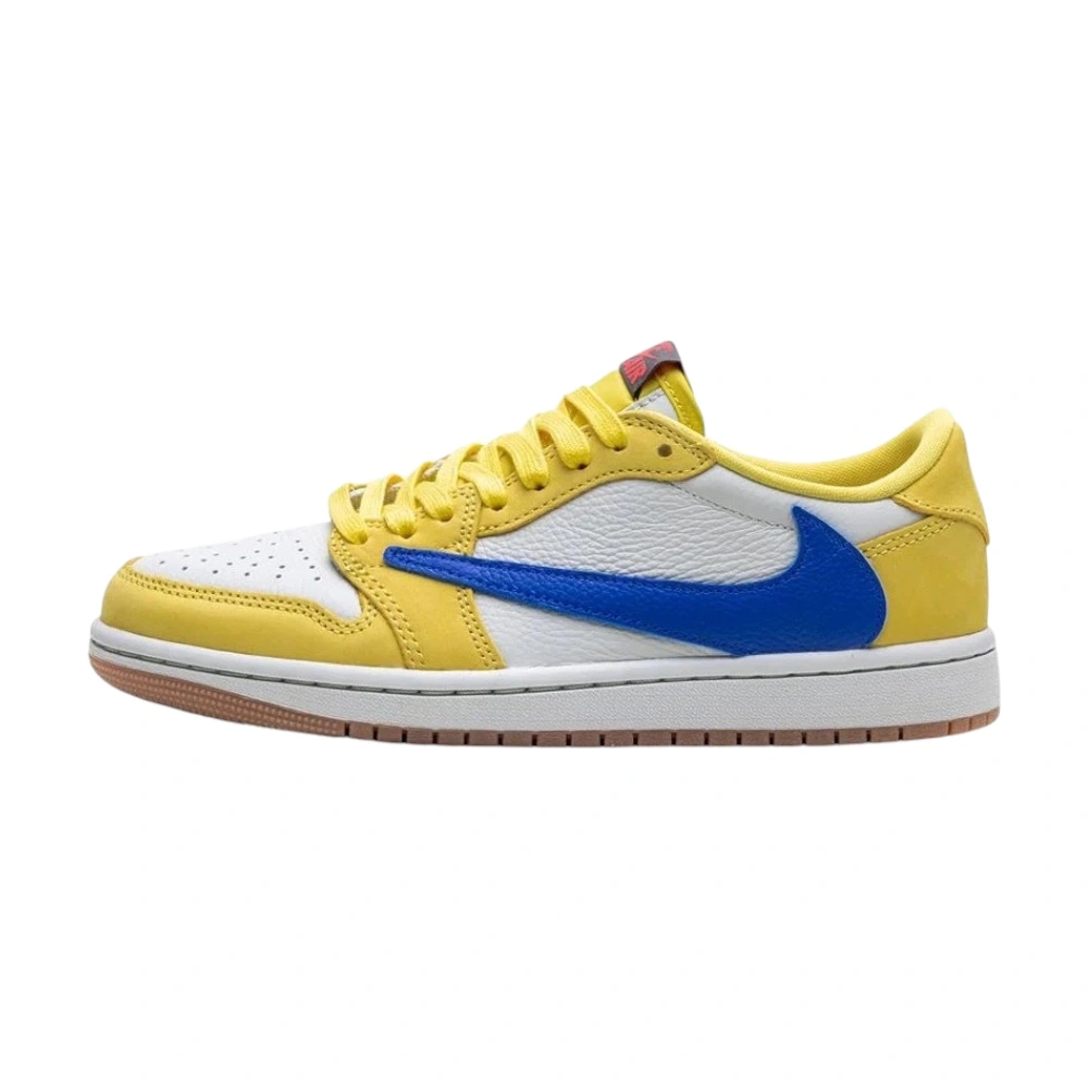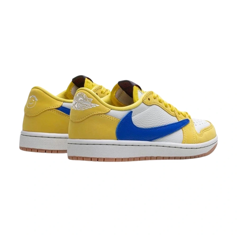 Air Jordan 1 Retro Low OG SP Travis Scott „Canary“ (Women’s) přinášejí odvážný a energický vzhled do ikonické spolupráce s Travisem Scottem. Svršek kombinuje žlutý semiš Canary Yellow s bílými koženými panely, které tvoří čistý kontrast. Hlavním vizuálním prvkem je velký reverzní Swoosh v sytě modré barvě na vnější straně, doplněný klasickým modrým Swooshem na straně vnitřní. Krémová mezipodešev dodává retro nádech, zatímco žlutá gumová podrážka zajišťuje trakci a odolnost. Červené akcenty na jazyku a vyšívané motivy na patě podtrhují charakteristický Travis Scott styl. Tento release patří k nejvýraznějším dámským modelům celé spolupráce.