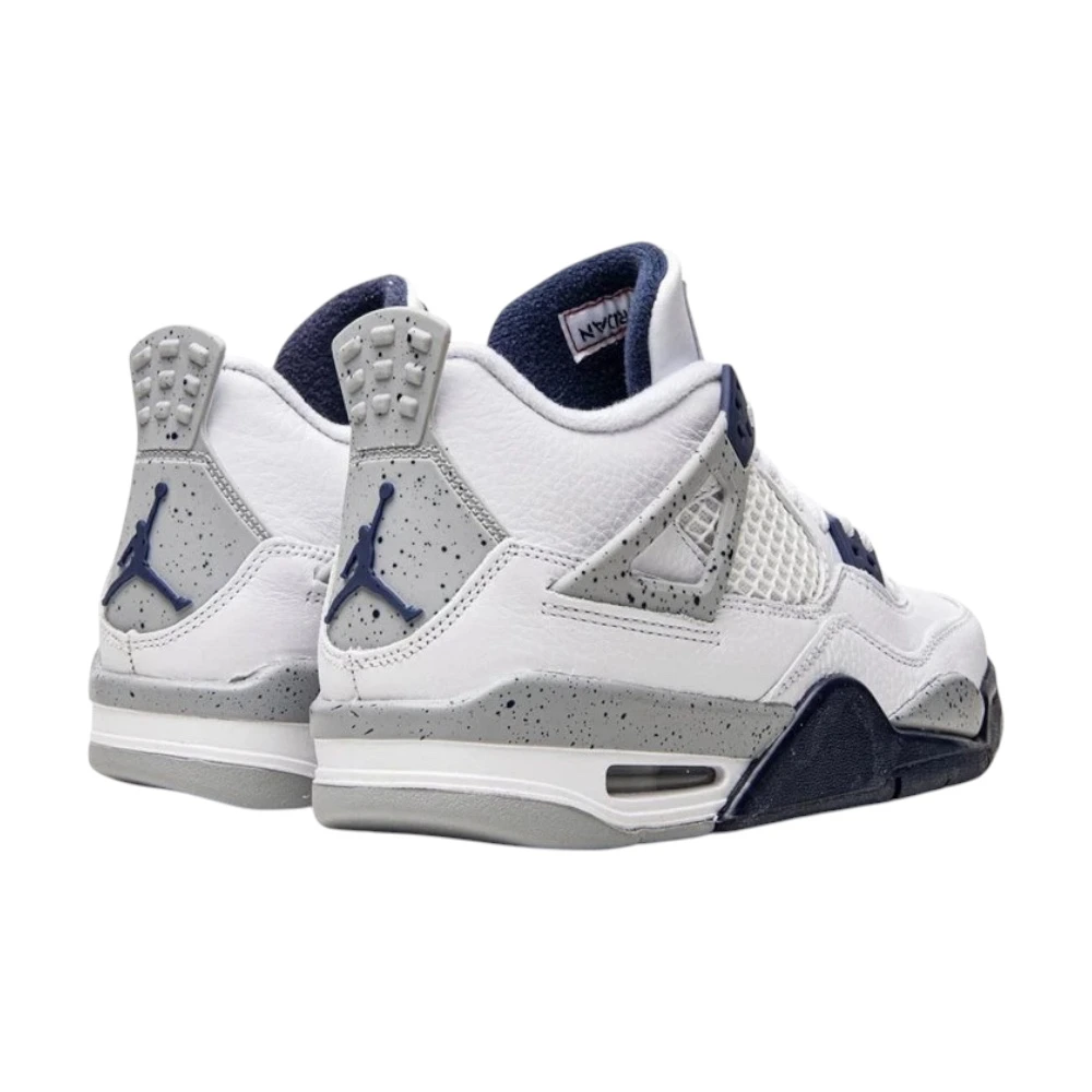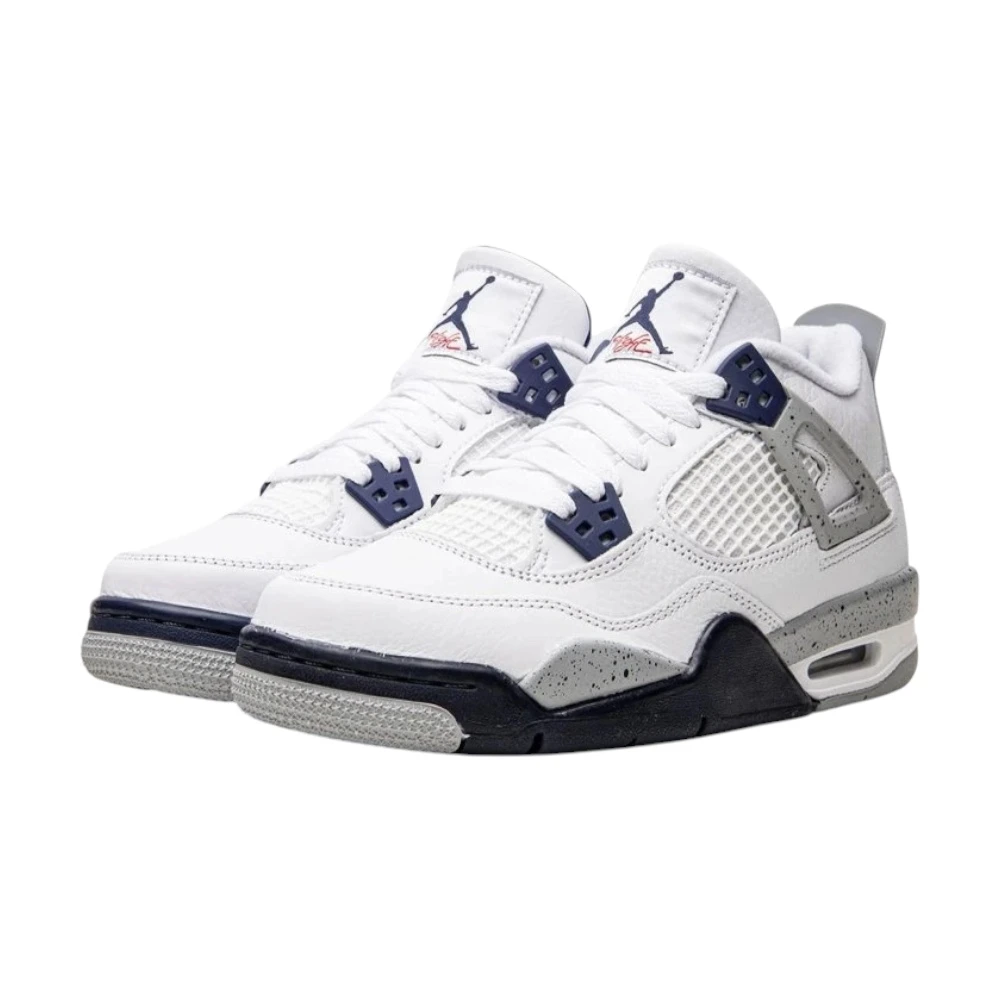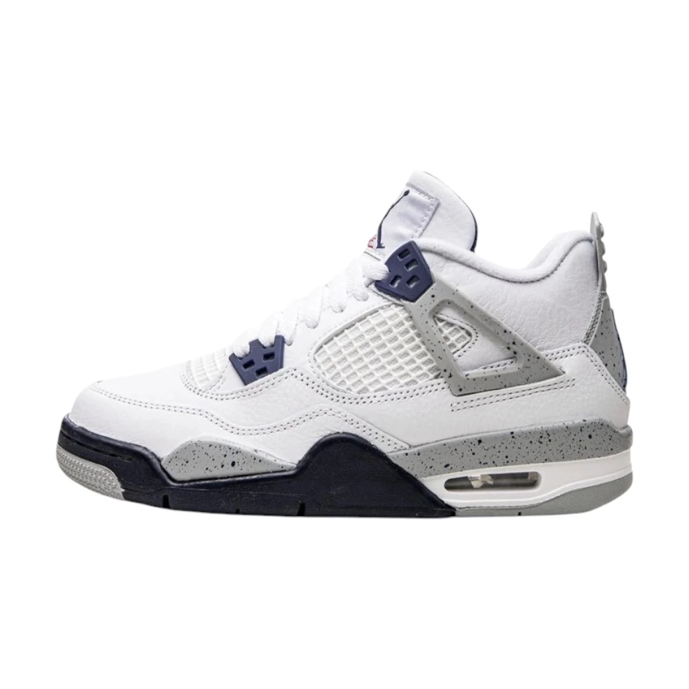 Jordan 4 „Midnight Navy“ (GS) – Bílý základ s tmavě modrými a cementově šedými detaily v juniorské verzi.
