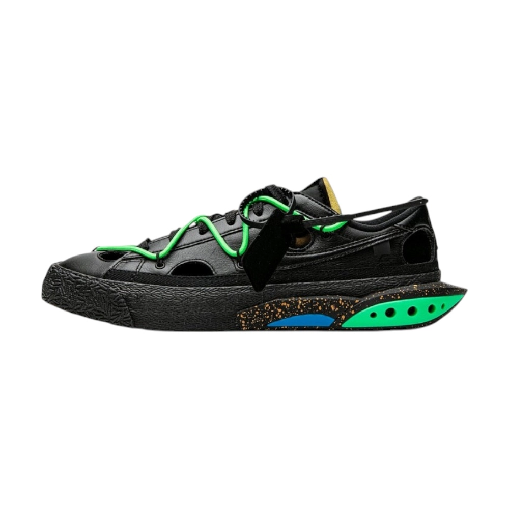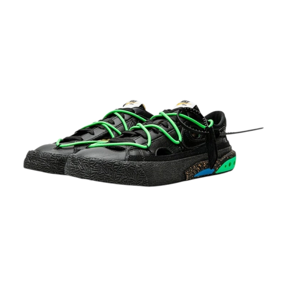 Nike Blazer Low Off-White „Black Electro Green“ – Černá kůže, Electro Green akcenty, over-lace a Off-White podpisové detaily.