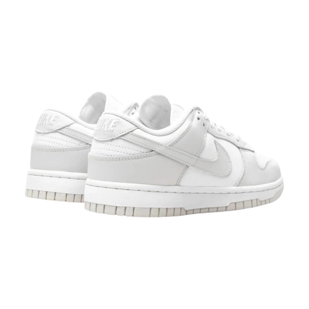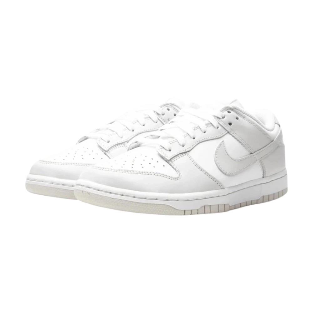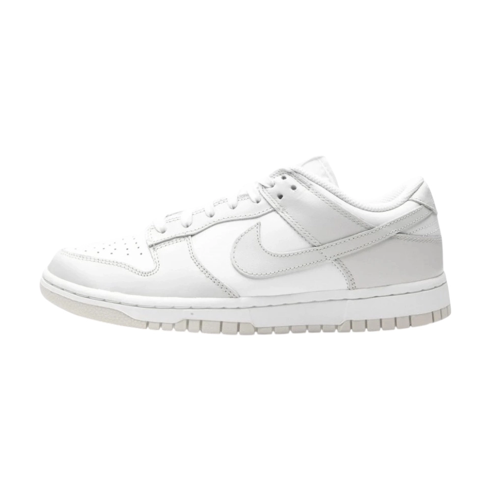Nike Dunk Low „Photon Dust“ (W) – Bílá kůže s jemně šedými překryvy pro čistý minimalistický vzhled.